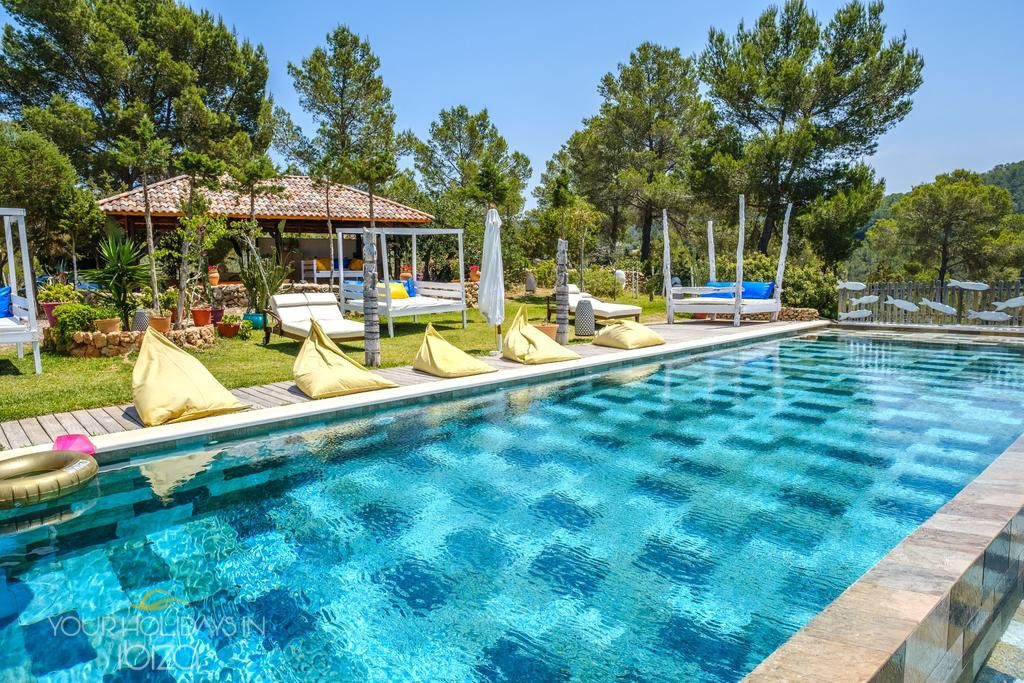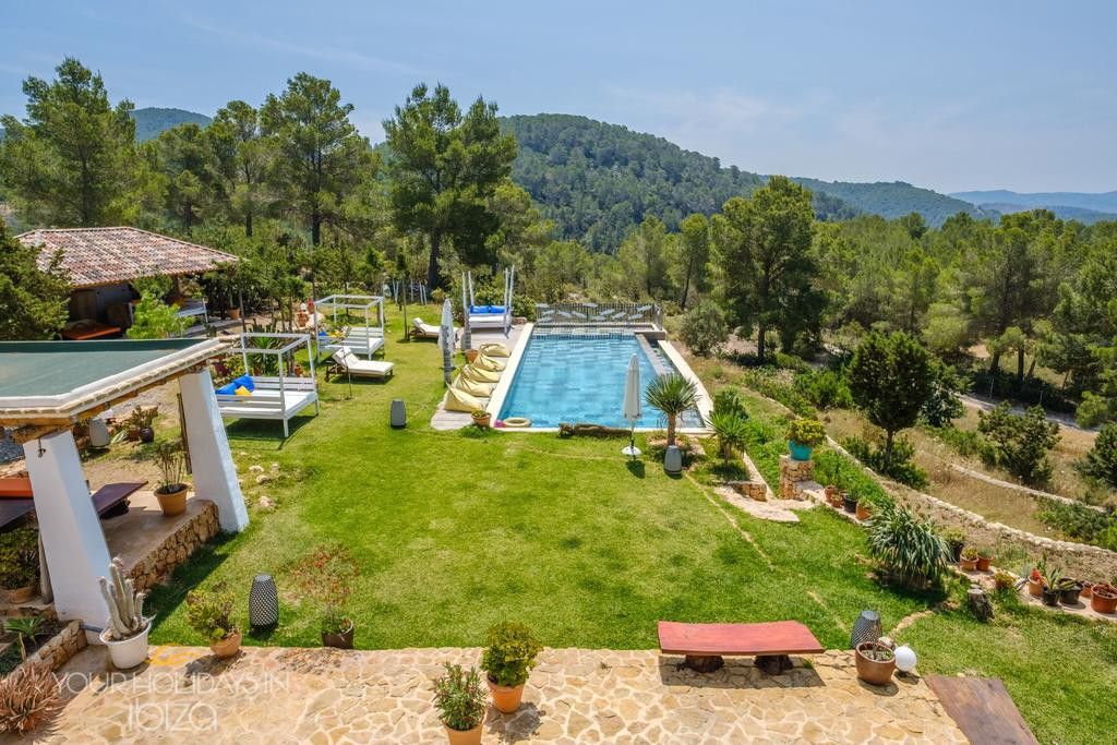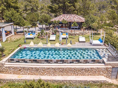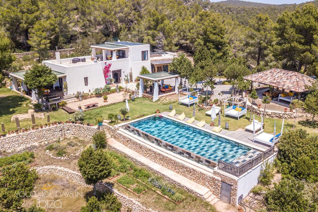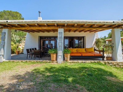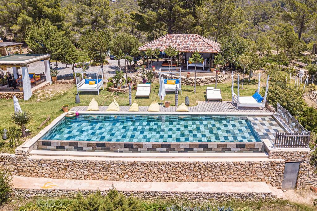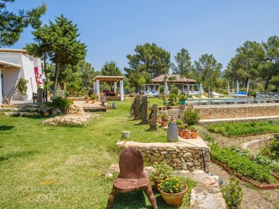 Ibiza holidays in Cala Saladas villa on the quiet pine-clad hills near San Antonio, this holiday home boasts spectacular views of the sea and Ibiza’s sunsets. The land of 50,000 m2 surrounding the villa allows to enjoy countless points that favor meditation, and there is a swimming pool, multiple areas to relax and eat outdoors, and a Mediterranean garden plus an orchard. It is assumed that all these spaces are privately enjoyed, with no neighbor in the whole field.